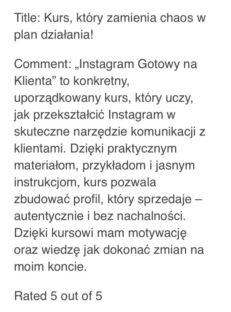 “Świetny, przystępny i zrozumiały, a skomplikowane rzeczy przedstawiony w bardzo prosty sposób. Idealny, jeśli chcesz wszystko dobrze po ustawiać i mieć pewność, że w twoim instagramie nie ma żadnych niedociągnięć. Bardzo mi pasuje to że kurs jest skoncentrowane na jednym temacie”.